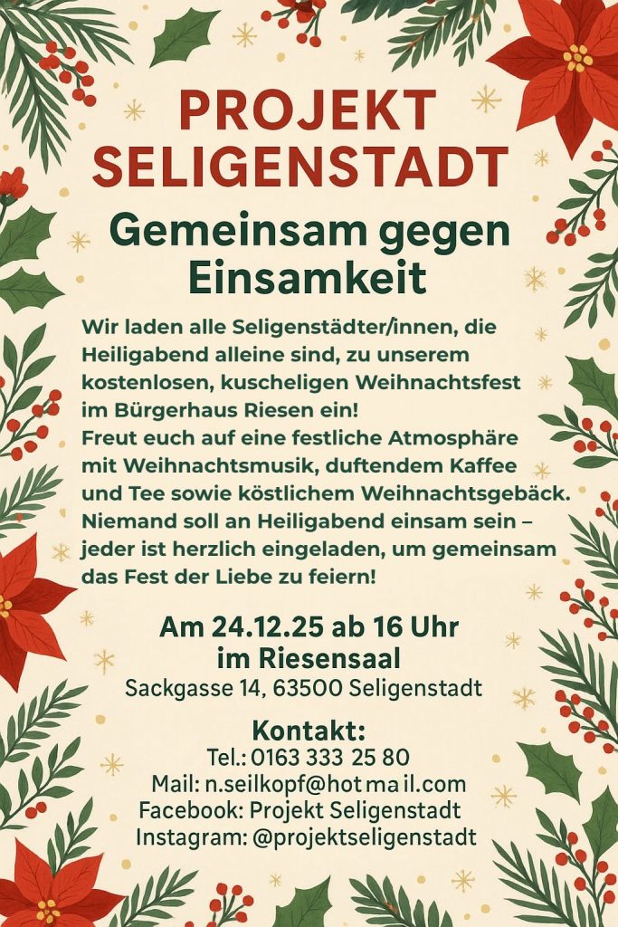 Alle, die Heiligabend in gemütliche und familiäre Atmosphäre verbringen möchten, sind herzlich eingeladen, mit uns gemeinsam das Fest der Liebe zu feiern. Es ist für leibliches wohl gesorgt und ist für alle kostenlos. Für unsere älteren Mitbürger/in, die nicht mobil sind, haben wir dieses Jahr ein Fahrdienst, die sie abholt und wieder nach Hause bringt.