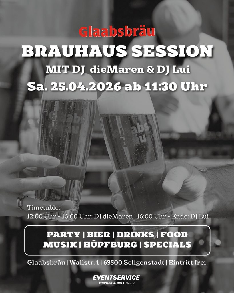 Am Samstag 25.04.2026 ab 11:30 Uhr wird unsere Brauerei zur Party-Location! - Beats von DJ dieMaren & DJ Lui - Unser naturbelassens Bier frisch genießen. PS: Ein ganz neues Bier haben wir auch am Start - Leckeres Food - Drinks - Hüpfburg für die kleinen Gäste Kommt vorbei und verbringt einen richtig schönen DayDrinking-Tag bei uns in der Brauerei – mit guter Musik, unserem bestem Bier und entspanntem Vibe. Und das Beste: Der Eintritt ist frei! Wir freuen uns auf euch!