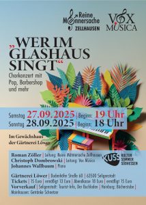 Die Chöre Vox Musica und Reine Männersache Zellhausen präsentieren Pop, Barbershop-Musik und mehr. Leitung: Christoph Dombrowski und Roman Zöller. Piano: Johannes Wallbaum