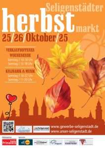 Im Rahmen des verkaufsoffenen Wochenendes öffnen die Geschäfte am Samstag von 10 bis 18 Uhr und am Sonntag von 13 bis 18 Uhr ihre Türen und bieten damit reichlich Gelegenheit zum Bummeln und Einkaufen in herbstlicher Atmosphäre. Für das leibliche Wohl und musikalische Unterhaltung ist ebenfalls gesorgt. Am Samstag von 16 bis 22 Uhr und am Sonntag von 11 bis 20 Uhr erwartet die Gäste ein vielfältiges gastronomisches Angebot und ein unterhaltsames Rahmenprogramm auf dem Marktplatz. Der Herbstmarkt wird vom Gewerbeverein Seligenstadt in Unterstützung durch die Seligenstadt Marketing & Tourismus GmbH und weiteren Partnern organisiert.
